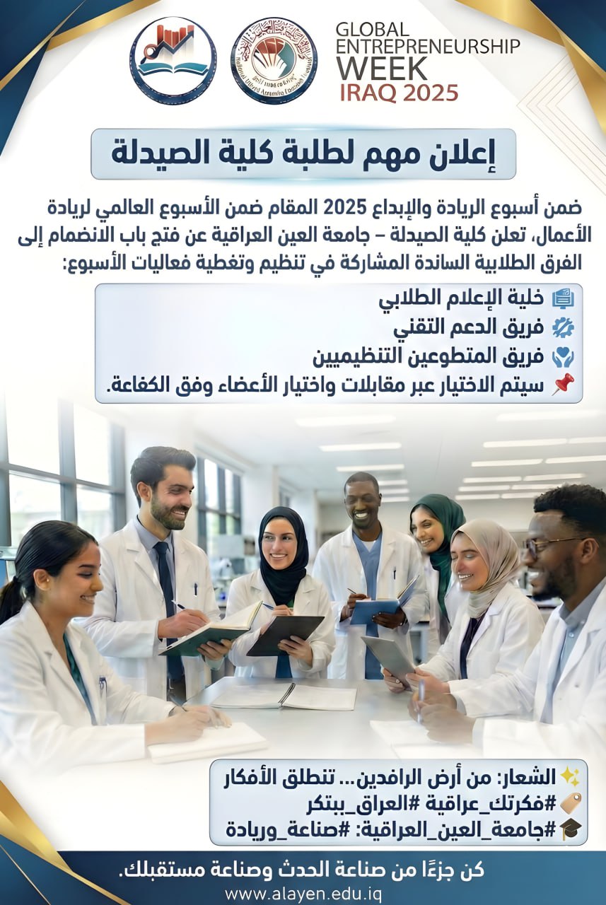 ضمن أسبوع الريادة والإبداع 2025، والمقام ضمن فعاليات الأسبوع العالمي لريادة الأعمال، تعلن كلية الصيدلة – جامعة العين العراقية عن فتح باب الانضمام إلى الفرق الطلابية الساندة للمشاركة في تنظيم وتغطية فعاليات الأسبوع.